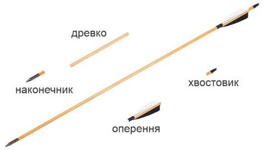Конструктивно стріли складаються з наконечника, держака, оперення та хвостовика: